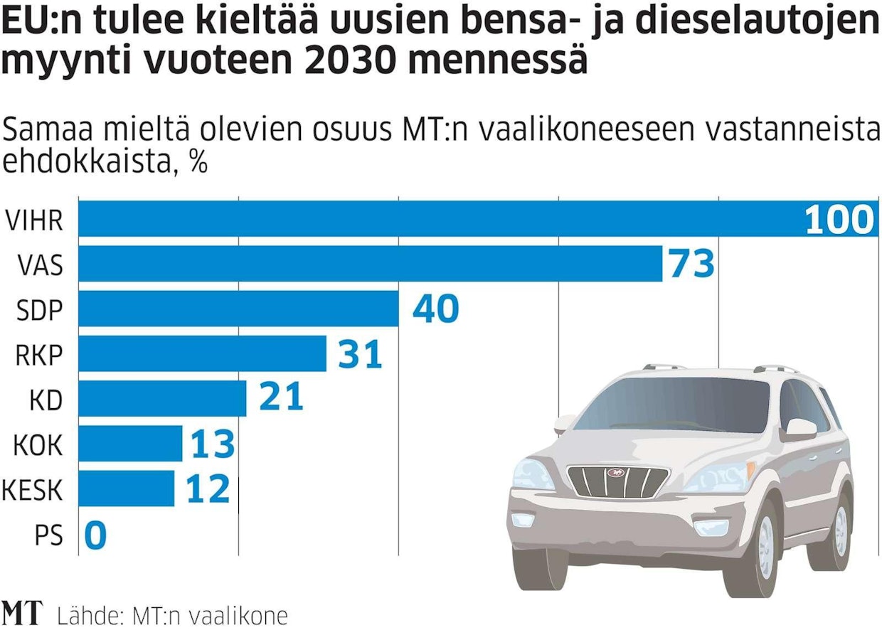 Uusien bensa- ja dieselautojen myynnin kieltoa on ehdotettu muun muassa Ruotsissa ja Tanskassa. Kuva: Carolina HusuEnemmistö vihreiden ja vasemmistoliiton MT:n vaalikoneeseen vastanneista ehdokkaista kannattaa uusien bensa- ja dieselautojen myynnin kieltämistä EU:ssa vuoteen 2030 mennessä.