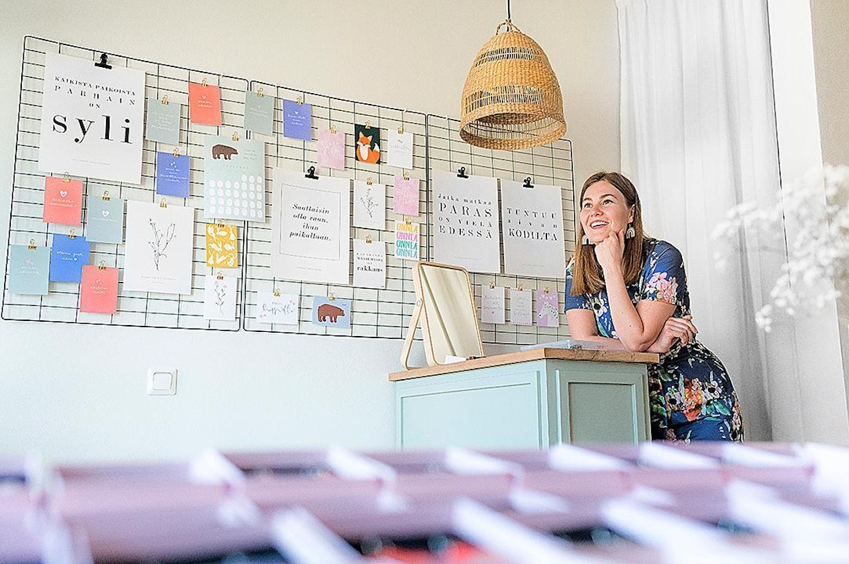 Omien töidensä suhteen Krista Niskanen on tehnyt selkeän rajauksen: kotinsa seinille hän ei omia julisteitaan ripusta, mutta läheisilleen hän postittaa omien mallistojen kortteja. Kuva: MISKA PUUMALAKesällä 2017 Niskanen valmistui sisustuspuolen muotoilijaksi ja palasi Kuopiosta kotiseudulleen Sotkamoon. Hän oli saanut kaupan alan töitä, mutta parin kuukauden kuluttua hyvä onni katkesi.