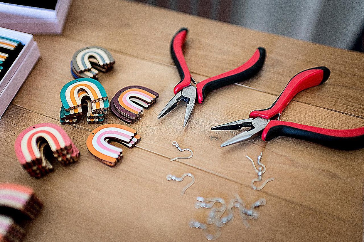 Koivuvanerista valmistetut korvakorut kootaan Sotkamossa. Krista Niskanen on harkinnut kokoamisen ulkoistamista, vaikka näpertääkin mielellään korujen parissa. Kuva: MISKA PUUMALAUuden askeleen Niskanen otti tammikuussa, kun hän allekirjoitti uuden työtilansa vuokrasopimuksen. Siihen asti hän oli tehnyt töitä kotoa käsin, mutta siinä oli omat ongelmansa.