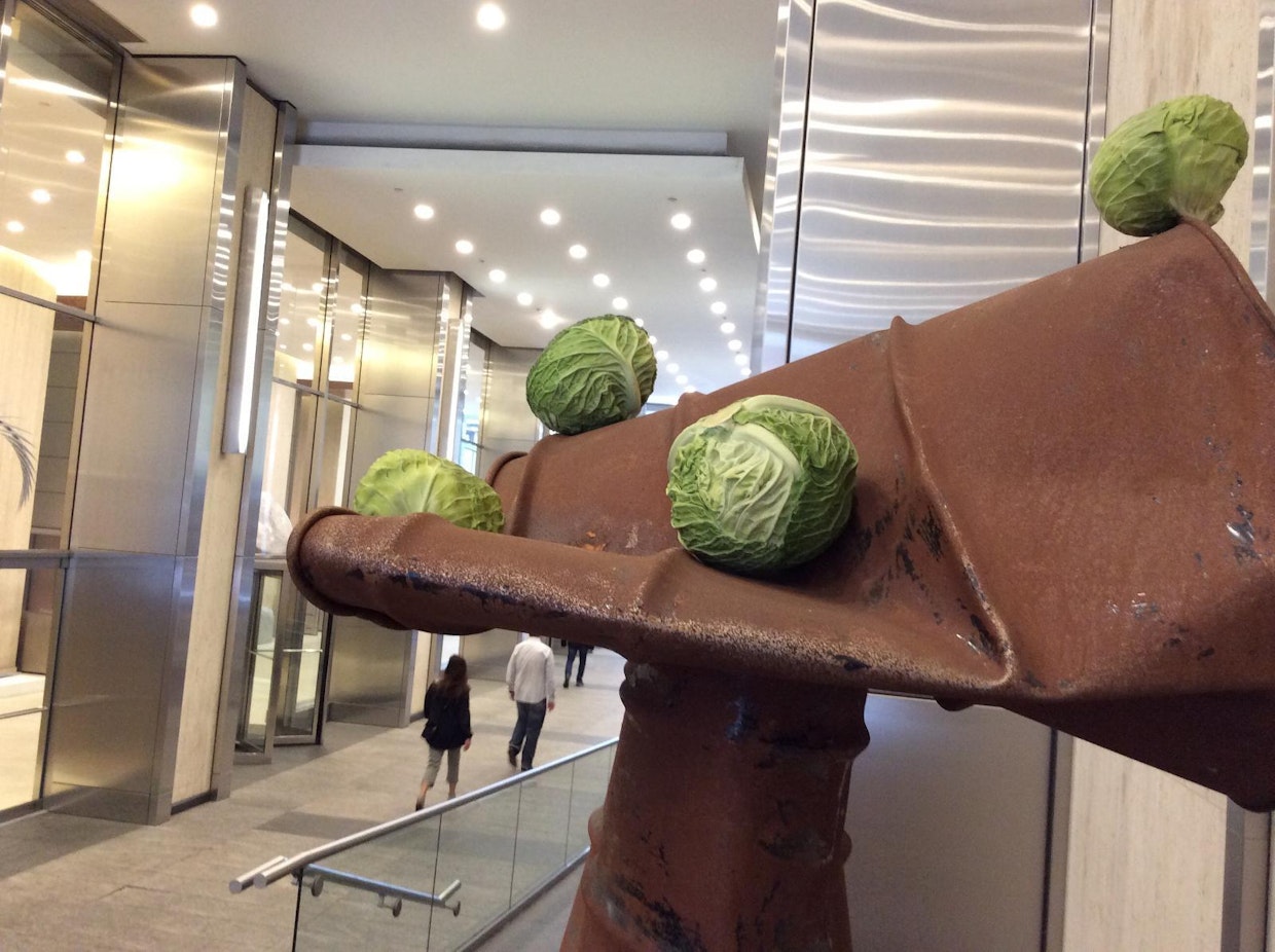 Yllättävin kaaliesiintymä on kuitenkin Marlborough-gallerian luona lähellä keskuspuistoa: vihreitä kaalinpäitä ruosteisten tynnyrien päällä. Tony Matellin kurttuista Tynnyrit-teosta koristavat kurttukaalit. Se on ehkä seuraava trendi lautasellakin.