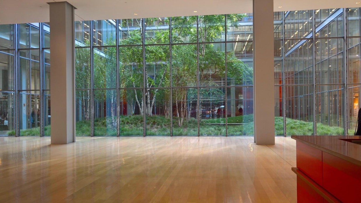 Seuraava koivikko on jo metsäisempi. Tiivis, lasiseinien sisään istutettu puurykelmä yllättää sanomalehti New York Timesin sisääntuloaulassa. Jälleen pehmentämässä lasista, virtaviivaista ja valtavan kokoista rakennusta.