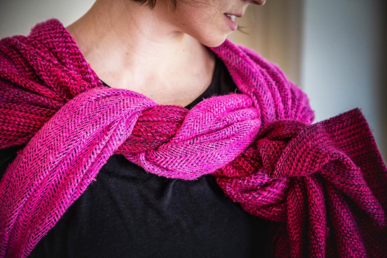 Anniina Salakka sitoo liinaa Helsingissä Kantoliinayhdistyksen pääkaupunkiseudun paikallisjaoston kantovälinetreffeillä maanantaina. Kuva: Sanne KatainenLapsen kantaminen kantoliinassa tai -repussa on yleistynyt Suomessa.
