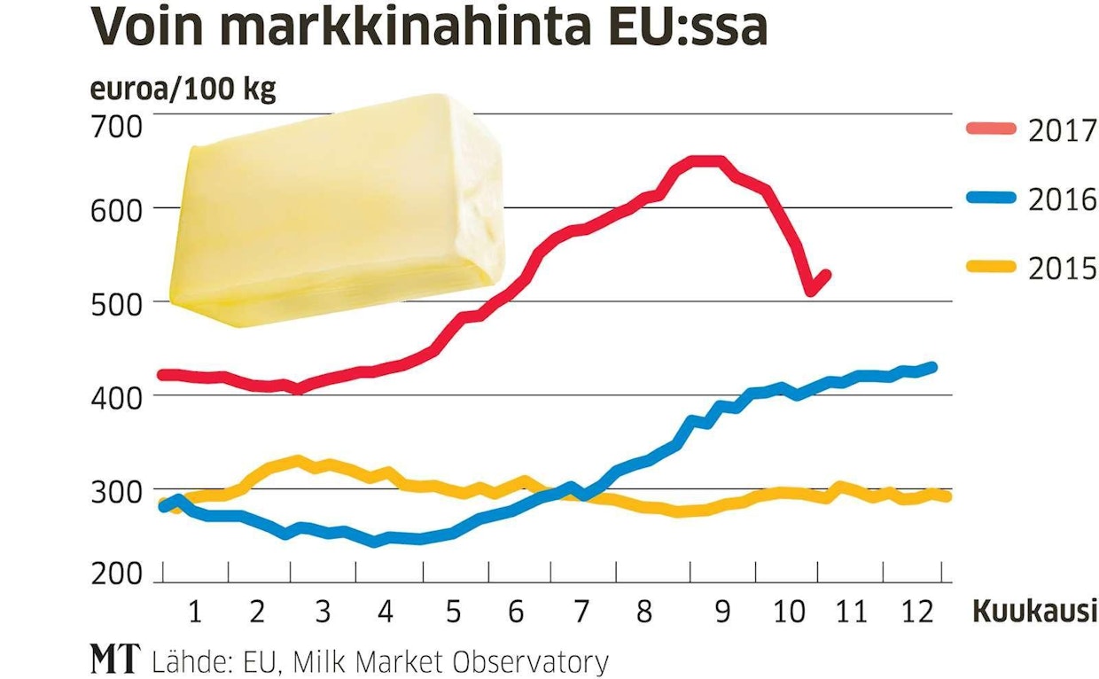 EU:n maitomarkkinaseurannan mukaan voikilosta maksettiin keskimäärin 5,3 euroa kilolta marraskuun toisella viikolla, lähes 30 senttiä enemmän kuin viikkoa aiemmin.