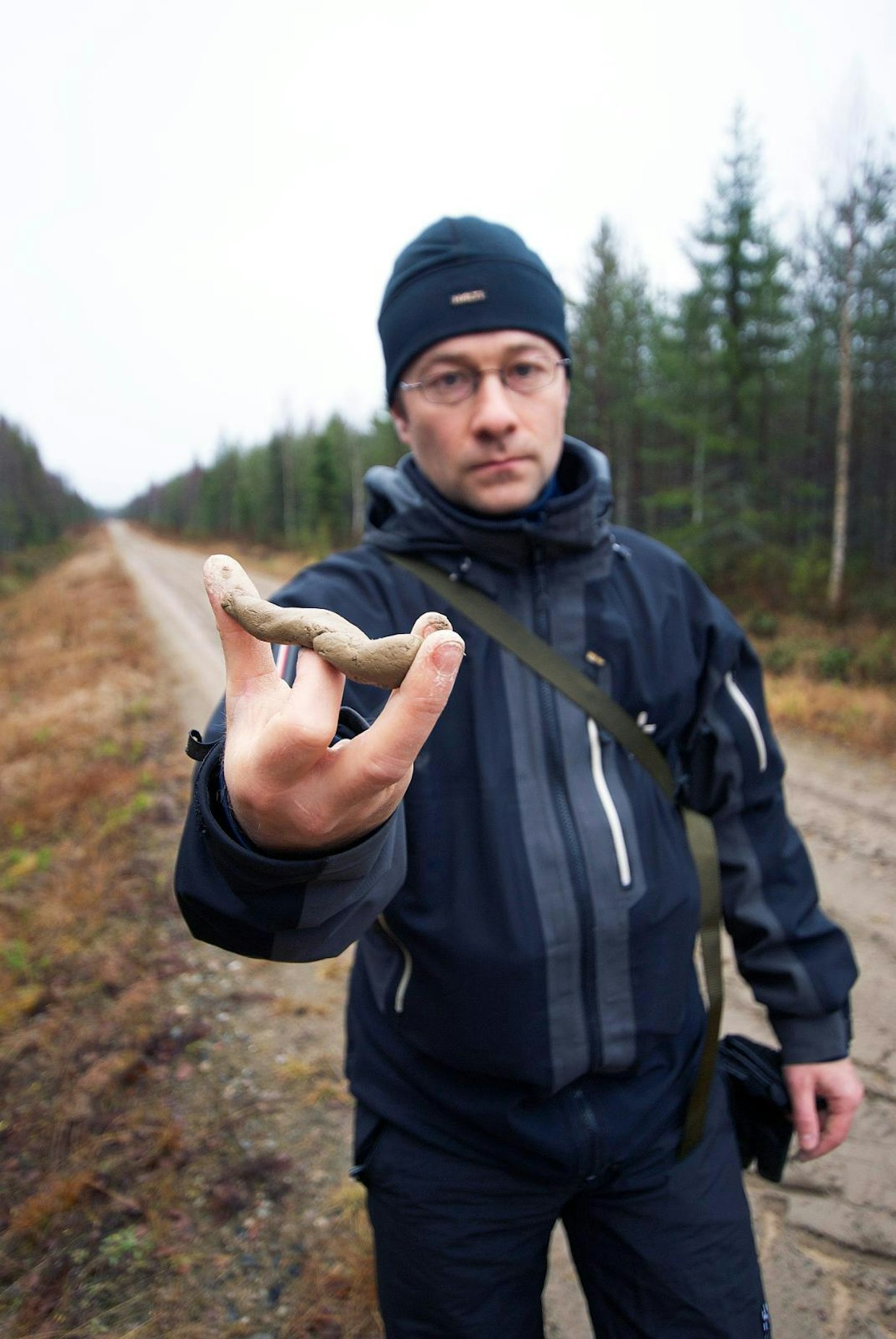”Jos tien pohjamaasta pystyy muovailemaan tämmöisen savipötkylän, maa on hienojakoista, ja kantavuudessa tulee helposti ongelmia”, Jussi Pirkonen näyttää. Pirkonen toimii Suomen Metsäkeskuksen pohjoisen palvelualueen rahoituksen ja tarkastuksen asiantuntijana Rovaniemellä. Kuva: Kari Lindholm