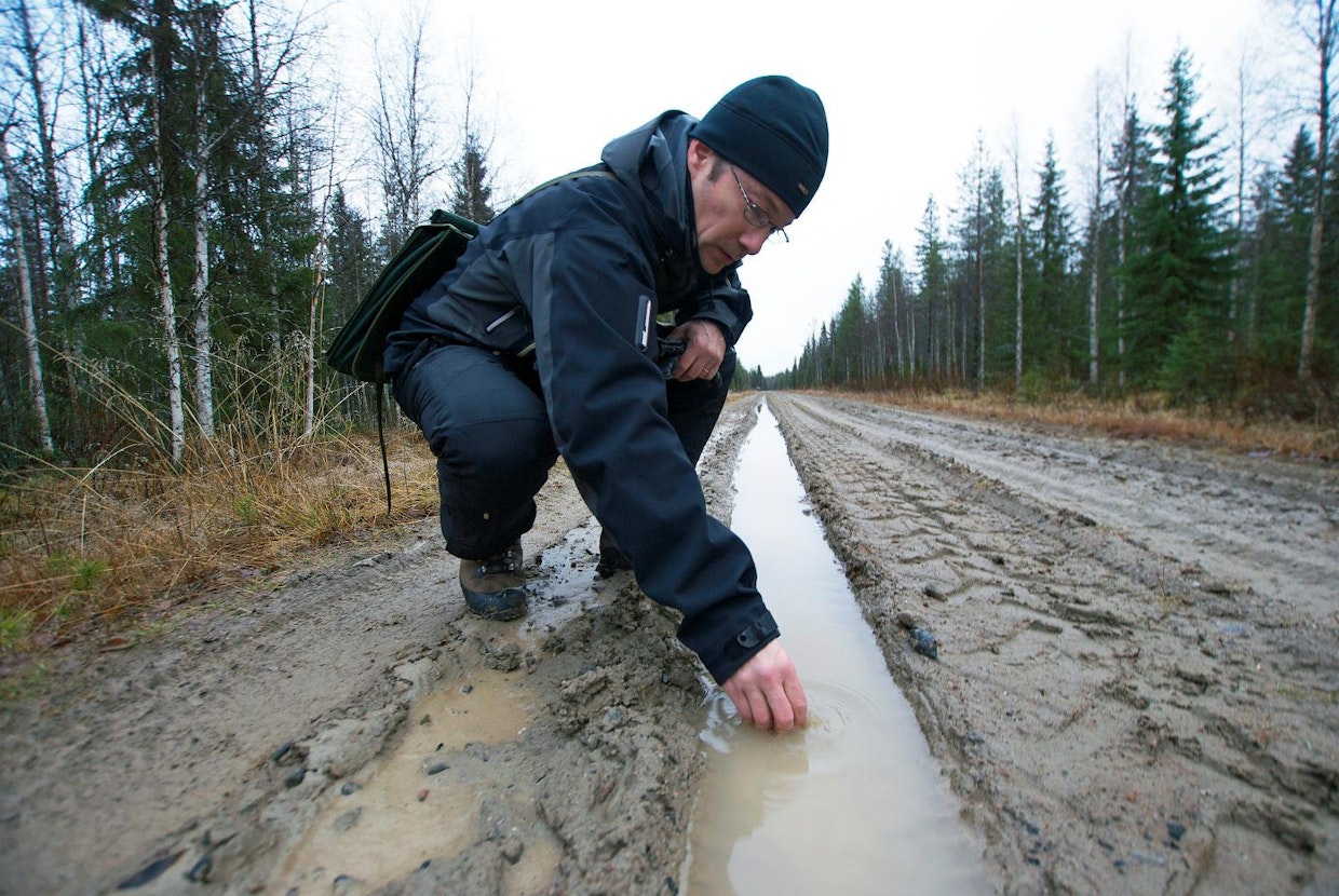 Pirkonen kaivaa savinäytettä Rovaniemen ja Ranuan rajamailla sijaitsevasta vuonna 2010 valmistuneesta metsätien pohjasta.