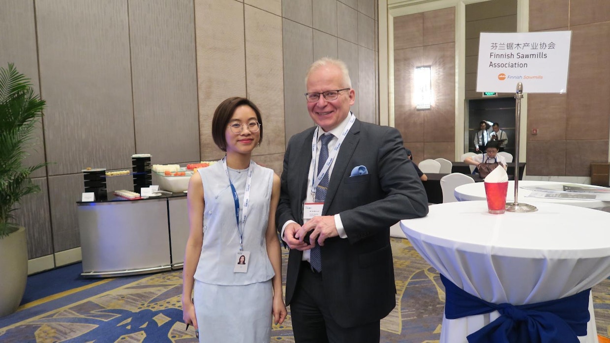 Lu Yan eli "Sini" ja Sahateollisuuden Kai Merivuori edustivat Pekingissä suomalaista sahatavaraa. "Matkan tärkein anti oli tavata paikallisia teollisuuden etujärjestöjen edustajia", Merivuori kertoo. Kuva: Terhi Pape-MustonenSuomalaisen sahatavaran vienti paisui viime vuonna ennätyslukuihin erityisesti Kiinaan matkanneen 1,7 miljoonan kuution ansiosta. Sen on 70 prosenttia enemmän kuin vuonna 2016.