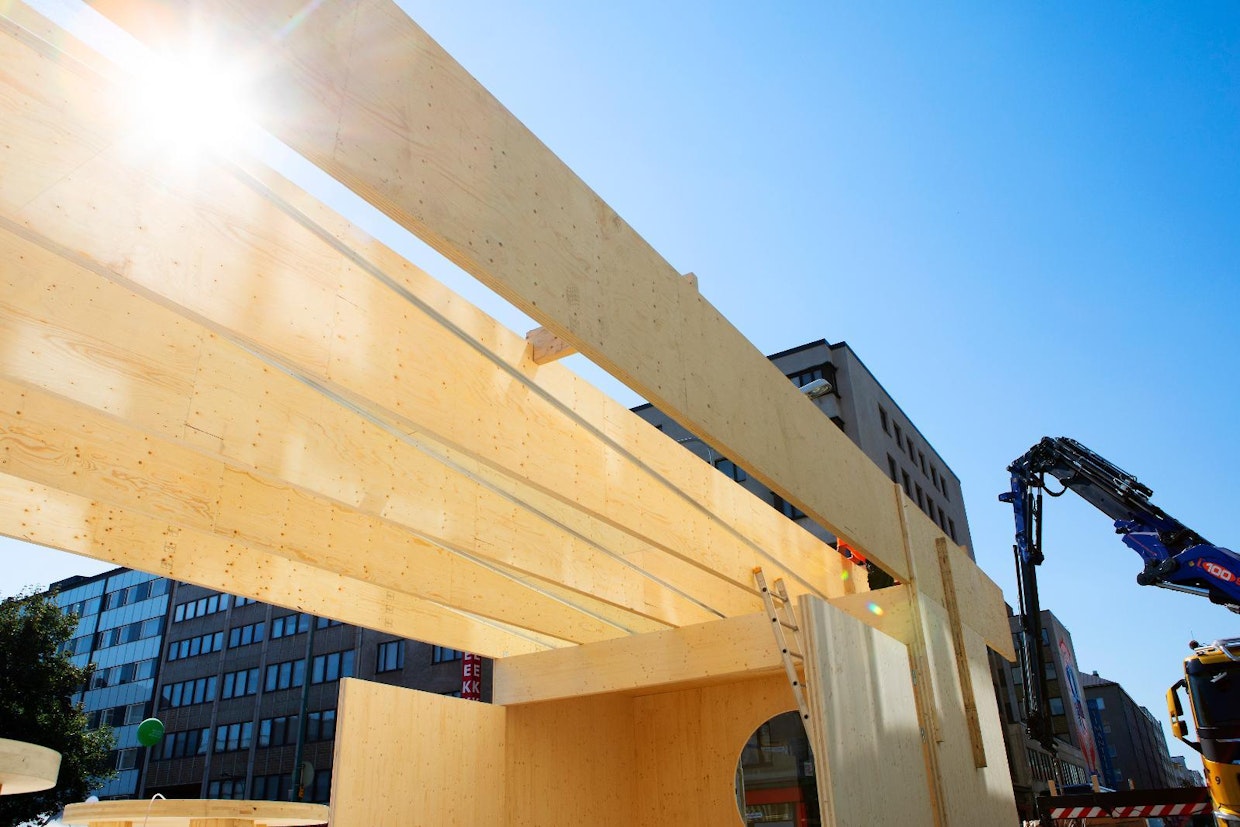 Stora Enson esittelemää puupaviljonkia alettiin pystyttää paikoilleen vasta maanantaina – Suomi-Areenan alkaessa. Wood Products -divisioonan johtaja Jari Suomisella on tähän vastaus.