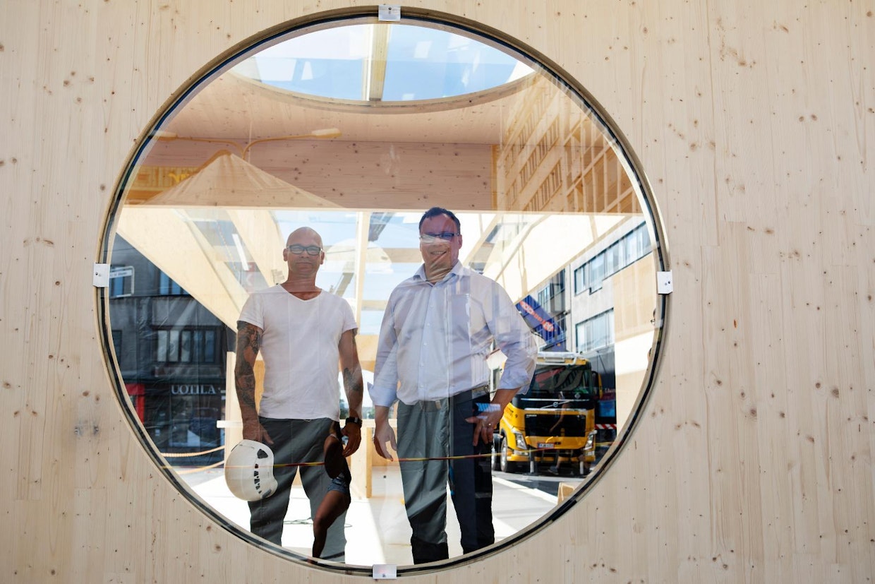 Paviljongin arkkitehti Marco Casagrande ja Stora Enso Wood Products -divisioonan johtaja Jari Suominen seurasivat paviljongin valmistumista Porissa tiistaina. Kuva: Carolina Husu
