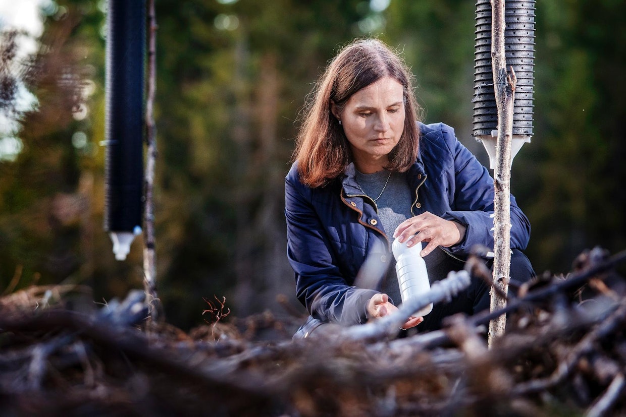 "Tänä kesänä kaarnakuoriaiset ehtivät aikuistua 2–3 viikkoa ennen lain päivämääriä", erikoistutkija Heli Viiri sanoo. Hän tutki kirjanpainajapyydykseen kertynyttä saalista keskiviikkona mittauspisteessä Tuupovaaran Luutalahdessa Joensuussa. Kuva: Lari Lievonen