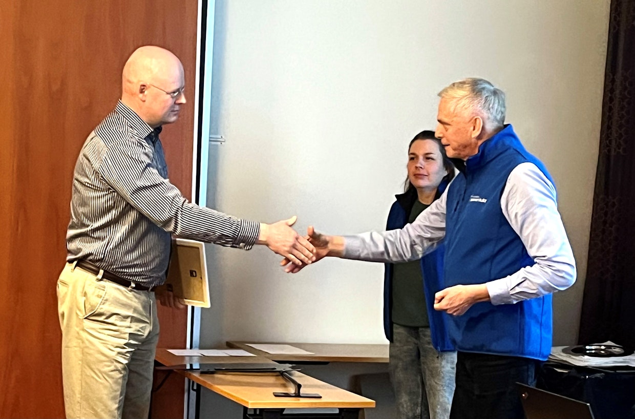 Kristian Värri (vas.) pokkasi tunnustuksen Sikayrittäjien Ari Bergiltä ja Kati Näsäröltä. Kuva: Eija Vallinheimo”Seuran metsästäjät ovat toimineet pitkään aktiivisesti villisikojen metsästyksen lisäämiseksi kehittämällä metsästysmenetelmiä ja yhteistyötä eri tahojen välillä”, korosti Suomen Sikaryrittäjät ry:n puheenjohtaja Ari Berg puheenvuorossaan.