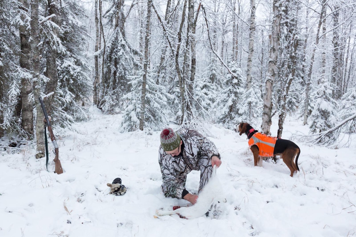 Hänninen sujauttaa tuuheaturkkisen talvijäniksen turkin läpäisevät karkeahauliset patruunat päällekkäispiippuisen haulikon pesään ja kävelee varovasti jäätä pitkin kohti niemeä.