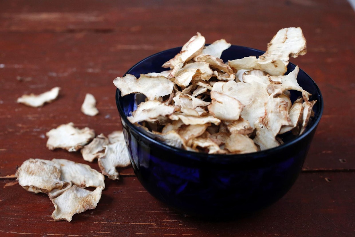 Pese maa-artisokat huolellisesti. Viipaloi leikkurilla ohuiksi siivuiksi. Anna kuivua kuivurissa yön yli.