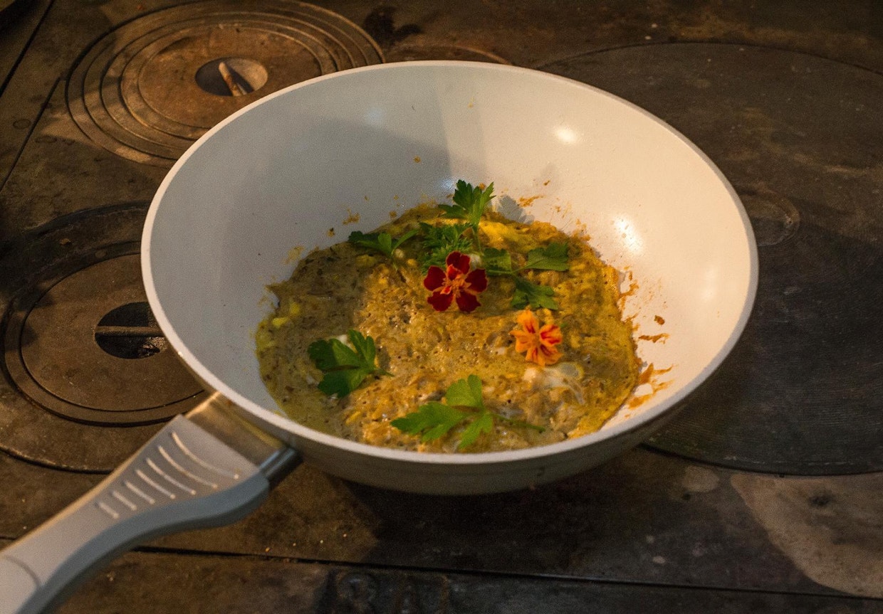 Raasta juurekset ja kuullota voissa pannulla. Sekoita munien rakenne rikki ja kaada pannulle. Paista kypsäksi ja mausta.