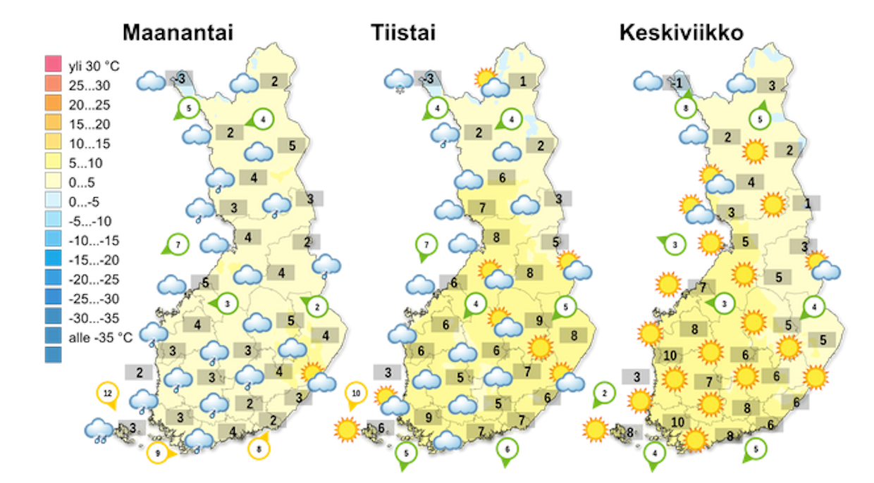 Tiistaiksi matalapaineen keskus on väistynyt Suomen itäpuolelle ja päivä on huomattavasti maanantaita poutaisempi. Aamulla maan itäosaan voi vielä yltää matalapaineen tuomien sateiden rippeitä.