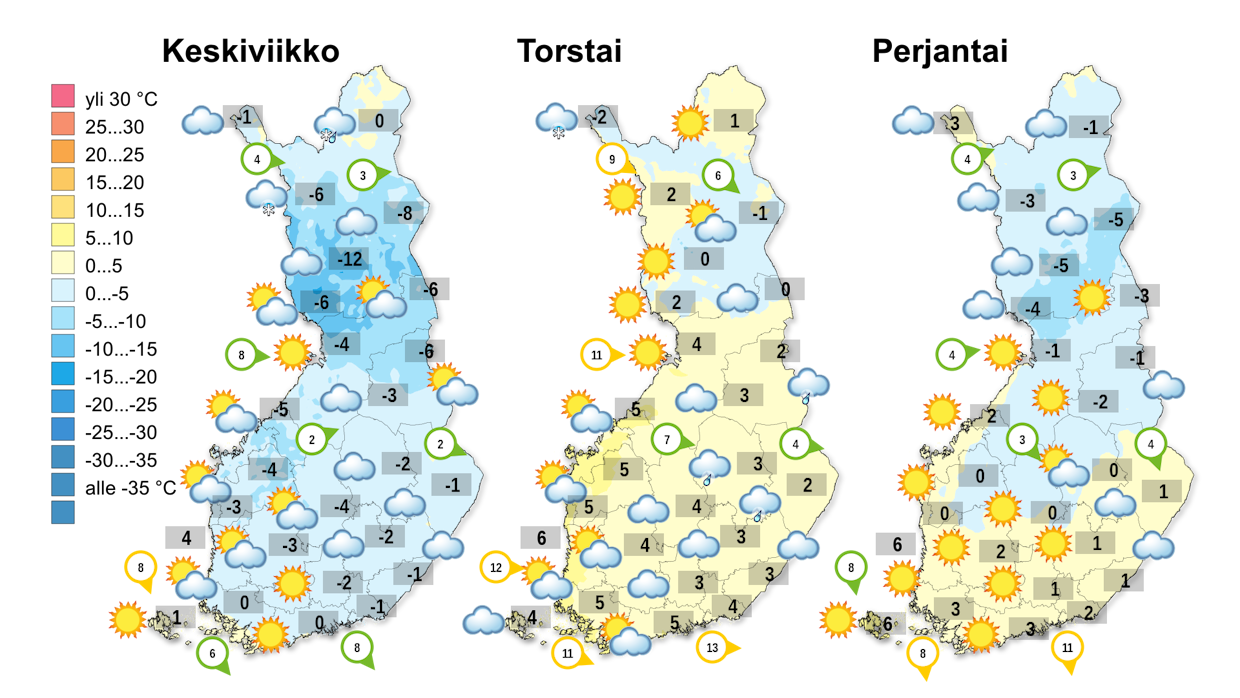 Kylmintä alkuiltapäivästä on Etelä-Lapissa, missä pakkasta on paikon yli kymmenen astetta. Rannikoilla ja Pohjois-Lapissa lämpötila on nollan asteen tuntumassa.