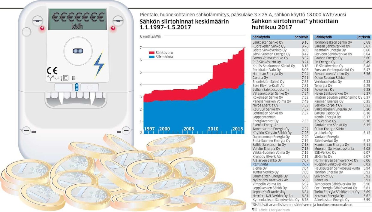 Energiaviraston tilaston mukaan pientalossa asuva 18 000 kilowattituntia (KWh) vuodessa kuluttava käyttäjä joutui maksamaan toukokuussa enimmillään siirtohintaa ja veroa yli 9 senttiä kilowattitunnilta Lankosken Sähkön alueella Siikaisissa ja alimmillaan 5,6 senttiä Äänekosken Energian alueella.