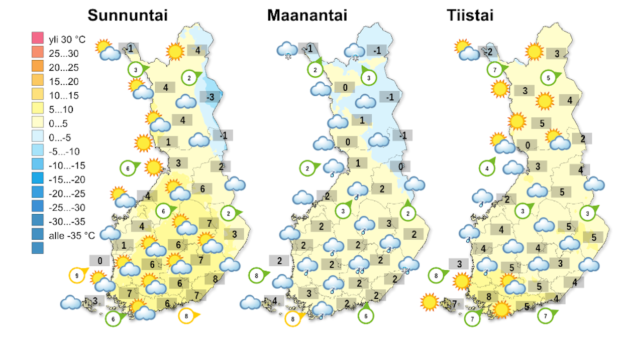 Sunnuntaina maan etelä- ja keskiosassa lumipeitteen väheneminen jatkuu, kun lämpötila nousee iltapäivällä korkeimmillaan noin kahdeksaan asteeseen. Länsirannikolla ja itärajan tuntumassa on kuitenkin hieman kylmempää. Myös Lapissa lämpötila kohoaa nollan yläpuolelle Itä-Lappia lukuun ottamatta.