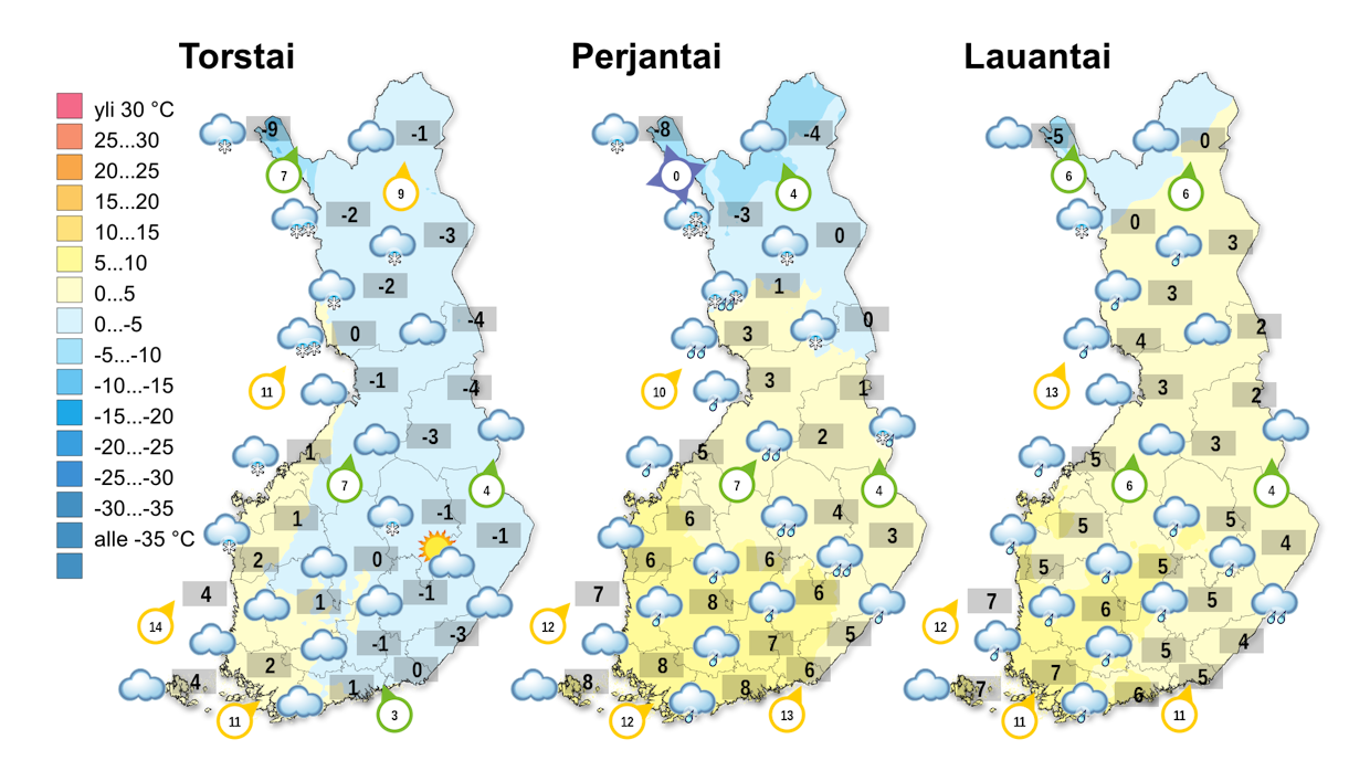 Päivällä jatkuu edellispäiviltä tuttu sävel sateiden osalta, tällä kertaa etelästä nousee vesisadealue. Alueen edetessä maan pohjoisosassa osa sateista tulee räntänä. Lämpötila on +1 ja +6, Pohjois-Lapissa +1 ja -5 asteen välillä.