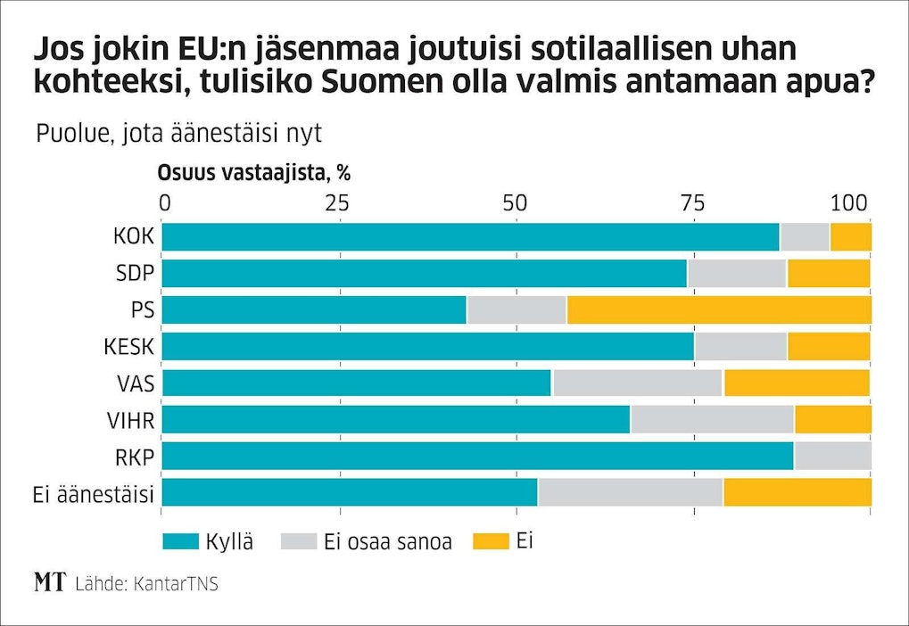 Kokoomusta äänestävistä lähes 70 prosenttia kannattaa sotilaallista tukea. Perussuomalaisia äänestävistä hieman alle kolmannes.