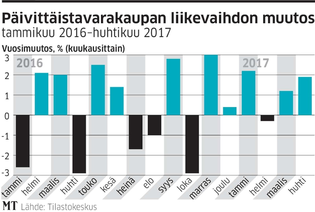"Merkillepantavaa on myös, että tilastokeskuksen hintaindeksin mukaan elintarvikkeiden ja alkoholittomien juomien hintataso on laskenut alkuvuonna 1,6 prosenttia. Se tarkoittaa, että volyymikehitystä on tapahtunut merkittävästi", hän huomauttaa.