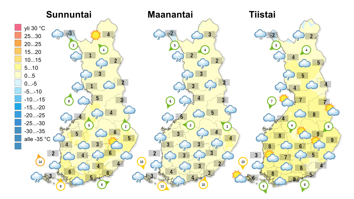 Päivälämpötilat vaihtelevat lähipäivinä pääosin nollan ja plus kahdeksan asteen välillä. Öisin lämpötila on aluksi nollan tienoilla tai vähän pakkasella. Keskiviikosta eteenpäin kovempiakin yöpakkasia esiintyy kuivemman säätyypin myötä koko maassa.