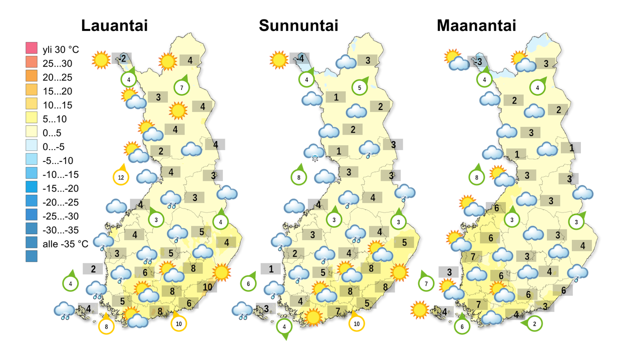 Baltiasta yltää lämmintä ilmaa viikonloppuna maan etelä- ja itäosaan. Lännessä ja pohjoisessa on sen sijaan viileämpää ja sateisempaa.Viikonloppuna sadealue ulottuu länsirannikolta kohti Keski-Suomea, Kainuuta ja Pohjois-Pohjanmaata. Näillä alueilla pilvisyys on runsasta ja sadetta voi kertyä viikonlopun aikana 10–20 mm. Muualla maassa sateet ovat selvästi vähäisempiä. Etenkin etelässä ja idässä on poutaista ja melko aurinkoista ja päivälämpötila voi kohota jopa runsaaseen 10 asteeseen.