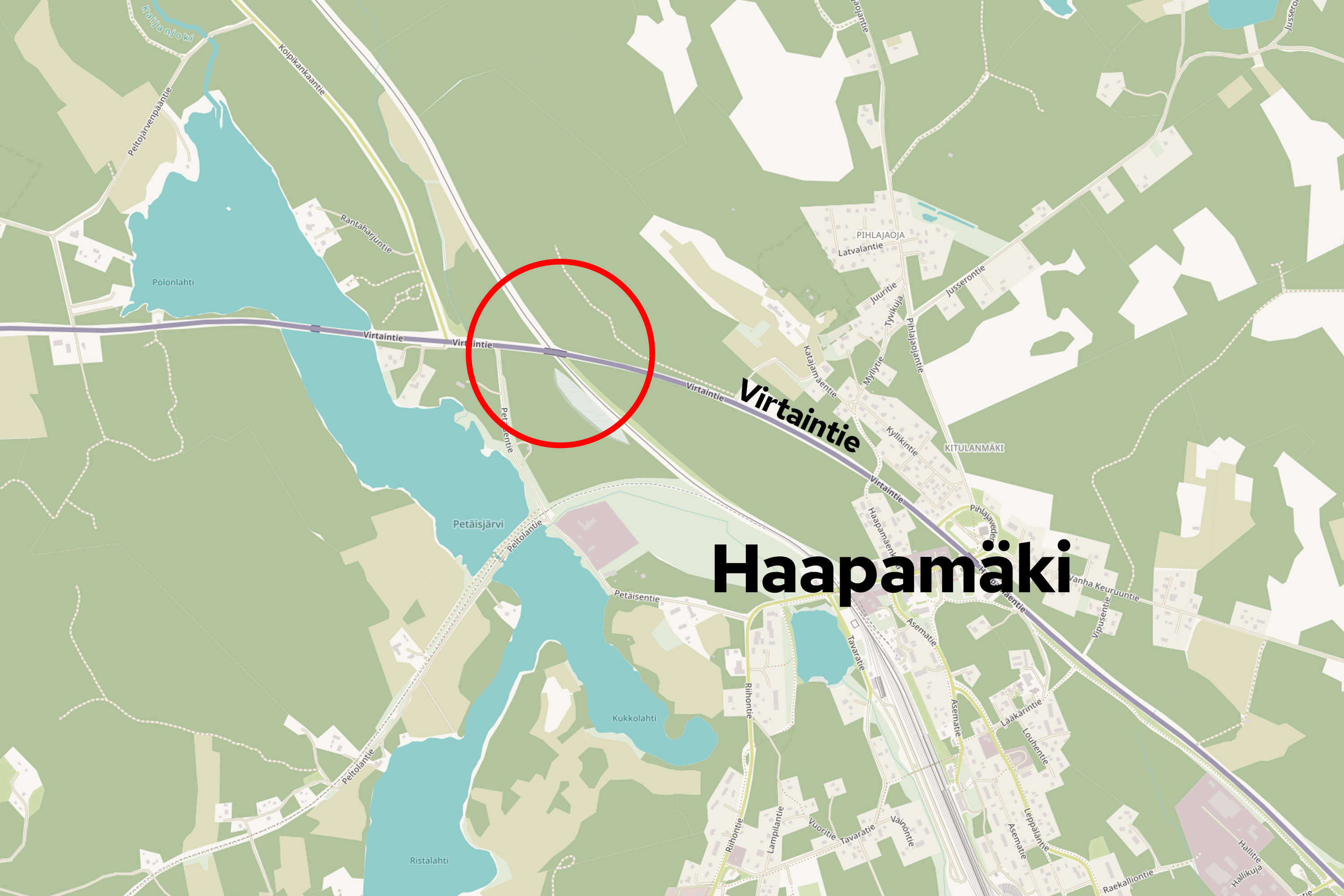 Valtatiestä sortui tien eteläpuolella, Porista päin tullessa oikealla puolella oleva kaista. Kuva: © OpenStreetMap / käsittely: Lari LievonenKaista sortui elyn mukaan pohjatutkimuksiin liittyvien kairausten yhteydessä. Sortuman yhteydessä loukkaantui yksi työntekijä, jolla ei ole hengenvaaraa.