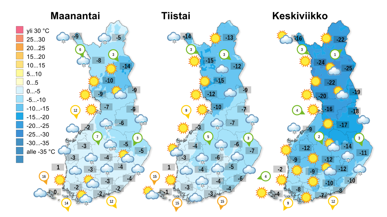 Keskiviikkona sää on edelleen poutaista ja laajalti aurinkoista. Lämpötila on tiistaita alhaisempi koko maassa ja maan keskiosassakin voidaan olla 15 pakkasasteessa. Lapissa pakkanen kiristyy jopa -30 asteeseen. Illalla pilvisyys jälleen lisääntyy lännestä lähestyvän matalapaineen edellä. Matalapaineen reitti on vaihdellut säämallien ajojen välillä merkittävästi, joten vielä ei Helsinkiinkään voi merkittäviä lumikertymiä lupailla.