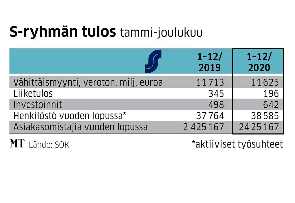S-ryhmän toimialoista marketit ylsivät suureen myynninkasvuun ja ennätystulokseen ruuan myynnillä, kun taas matkailu- ja ravitsemiskauppa supistuivat rajusti.S-ryhmä kertoo ottaneensa koronavuoden kurimuksesta torjuntavoiton. Vuoden 2020 liiketulos oli 196 miljoonaa euroa, mikä oli merkittävä pudotus edellisvuoden 345 miljoonaan euroon. Koko S-ryhmän veroton vähittäismyynti supistui 0,7 prosenttia ja oli reilut 11,6 miljardia euroa.
