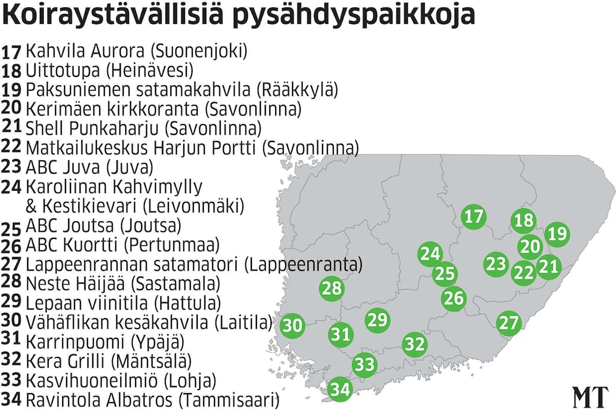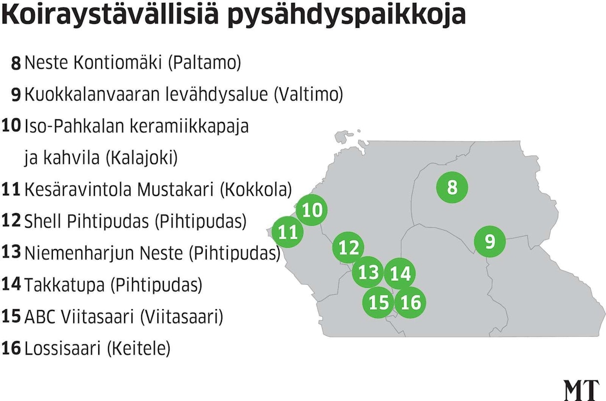 Maaseudun Tulevaisuus pyysi lukijoilta Facebookissa vinkkejä, missä koiraperheen kannattaa pysähtyä. Vinkit on koottu jutun karttoihin.