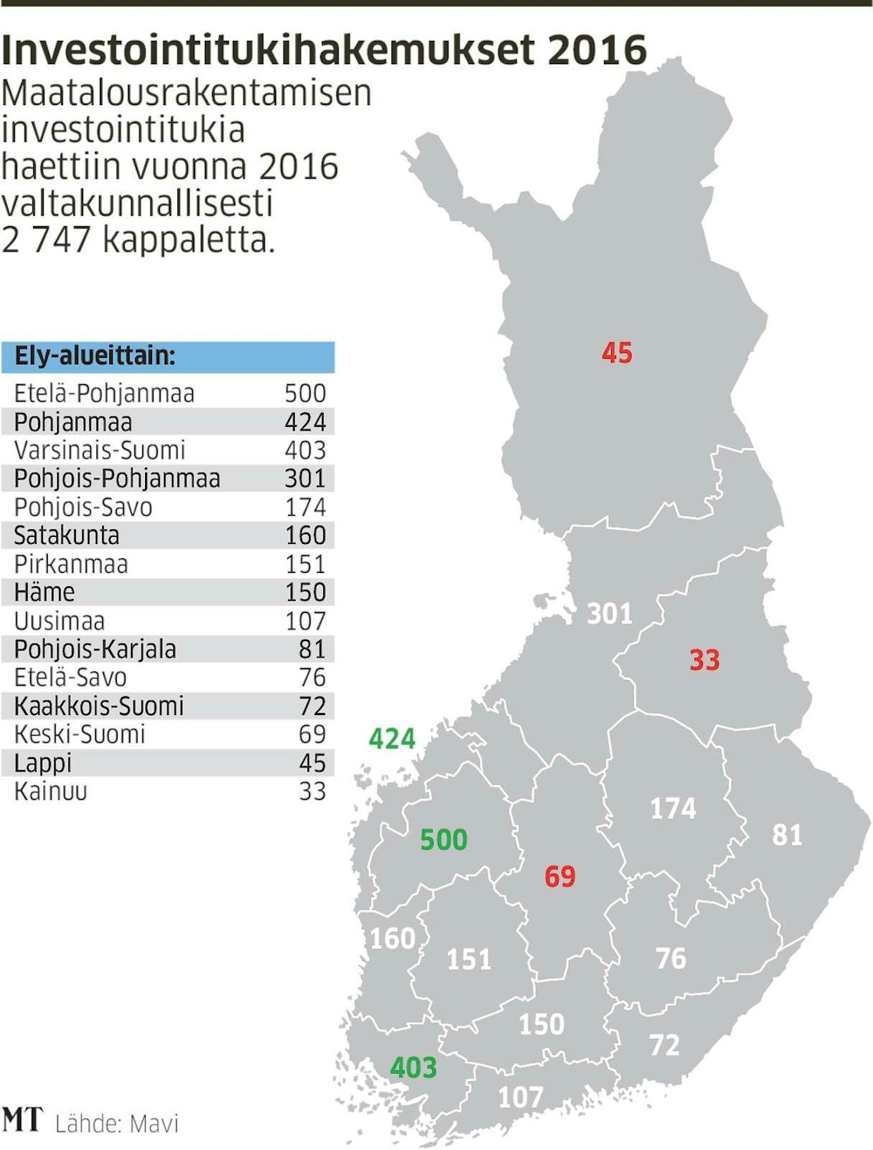 Suomessa tehtiin viime vuonna yhteensä 2 747 investointitukihakemusta tuotantorakentamisen investointeihin.Maatalousrakentamisen investointitukia haettiin vuonna 2016 valtakunnallisesti 2 747 kappaletta.